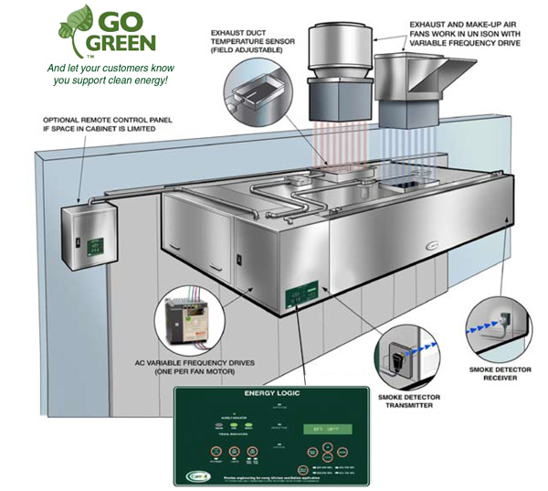 Carroll’s Energy Logic Hood Controller can be installed in nearly any commercial kitchen ventilation system. When made part of your hood system, the electronic control panel matches energy use to the load requirements that vary throughout the day, unlike conventional systems that waste energy by maintaining peak output at all times.