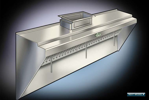Low wall backshelf baffle filter grease extractor noncompensating ventilator for counter height equipment. For all types of cooking equipment