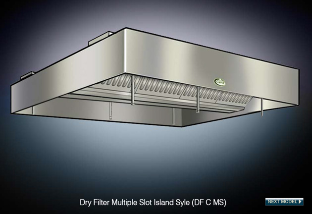 Island style multi-slot baffle filter grease extractor non-compensated ventilator. For all types of cooking equipment in back-to-back appliance configuration