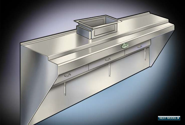 Low wall backshelf baffle filter grease extractor noncompensating ventilator for counter height equipment. For all types of cooking equipment
