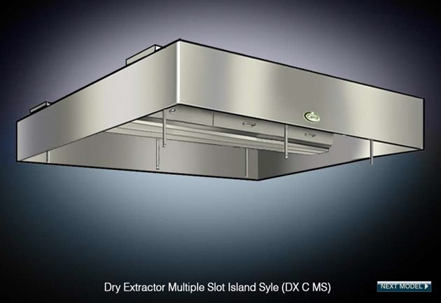 Island style high velocity multi-slot dry extractor ventilator with integrated make-up air. For all types of cooking equipment in a back-to-back appliance configuration